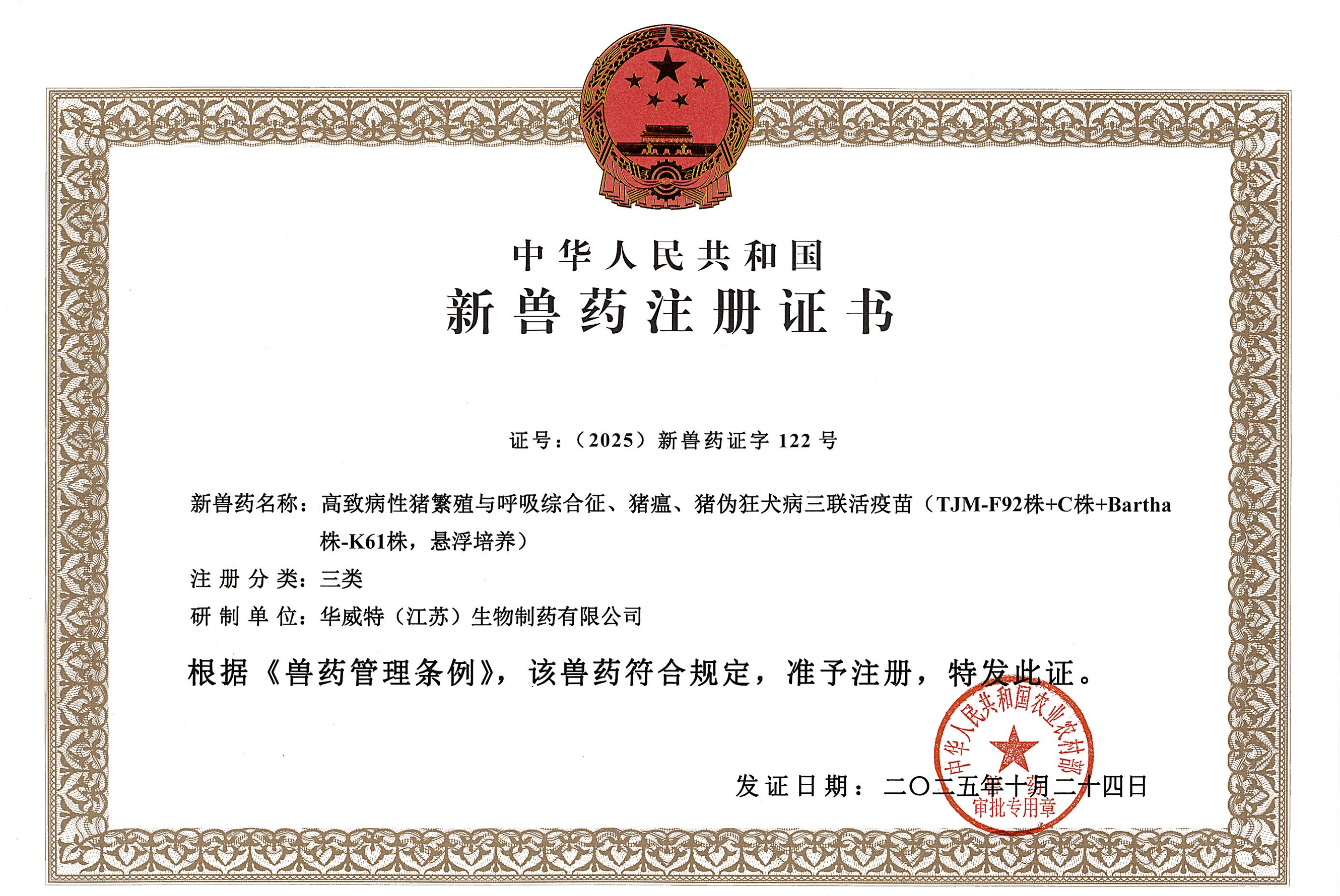 【喜报】热烈祝贺华威特蓝耳-猪瘟-猪伪狂犬三联活疫苗获批新兽药注册证书!